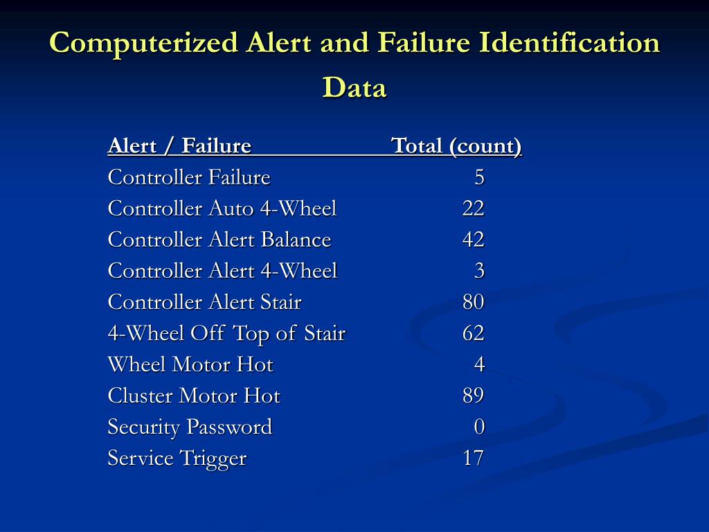 Computerized Alert and Failure Identification Data Alert / Failure Total (count) Controller Failure 5 Controller Auto 4-Wheel 22 Controller Alert Balance 42 Controller Alert 4-Wheel 3 Controller Alert Stair 80 4-Wheel Off Top of Stair 62 Wheel Motor Hot 4 Cluster Motor Hot 89 Security Password 0 Service Trigger 17