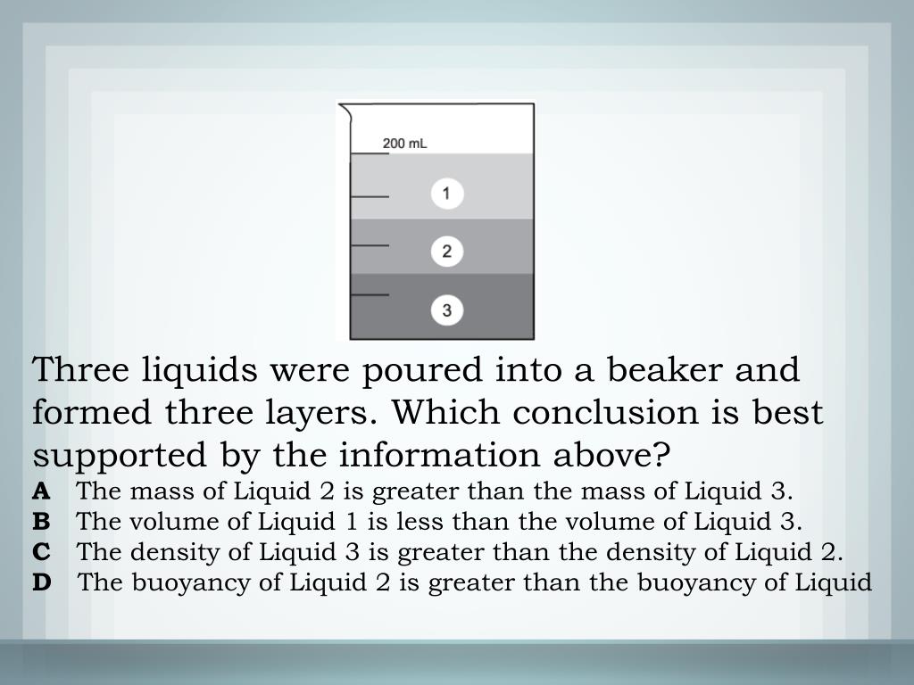 Three liquids were poured into a beaker and formed three layers. Which conclusion is best supported by the information above? A The mass of Liquid 2 is greater than the mass of Liquid 3. B The volume of Liquid 1 is less than the volume of Liquid 3. C The density of Liquid 3 is greater than the density of Liquid 2. D The buoyancy of Liquid 2 is greater than the buoyancy of Liquid