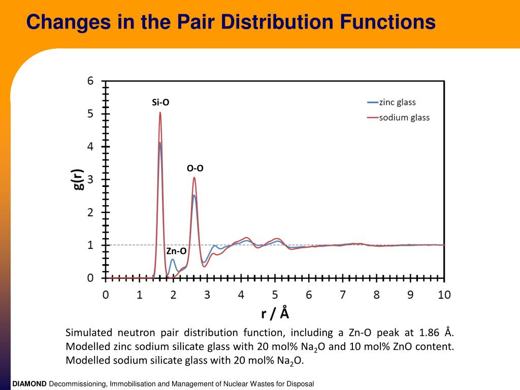 Changes in the Pair Distribution Functions Si-O O-O Zn-O Simulated neutron pair distribution function, including a Zn-O peak at 1.86 Å. Modelled zinc sodium silicate glass with 20 mol% Na2O and 10 mol% ZnO content. Modelled sodium silicate glass with 20 mol% Na2O.