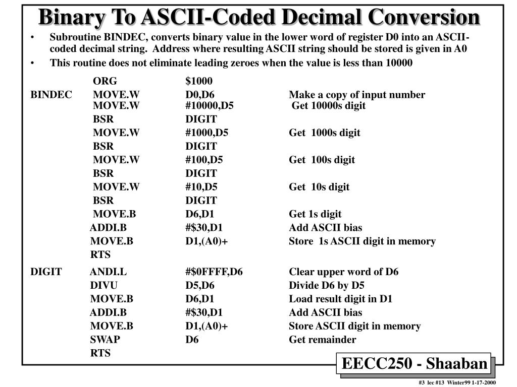 ASCII-Encoded Decimal To Binary Conversion • Subroutine DECBIN, assumes A0 to point at the highest character of a valid five character ASCII-encoded decimal number with a maximum value 65535 • The decimal number is converted to a one word binary value stored in the low word of D0 ORG $1000 DECBIN CLR.L D0 MOVEQ #5,D6 Initialize loop counter to get five digits NEXTD CLR.L D1 Clear new digit holding register MOVE.B (A0)+,D1 Get one ASCII digit from memory SUBI.B #$30,D1 Subtract ASCII bias $30 MULU #10,D0 Multiply D0 by 10 ADD.W D1,D0 Add new digit to binary value in D0 SUBI.B #1,D6 Decrement counter BNE NEXTD If not done get next digit RTS
