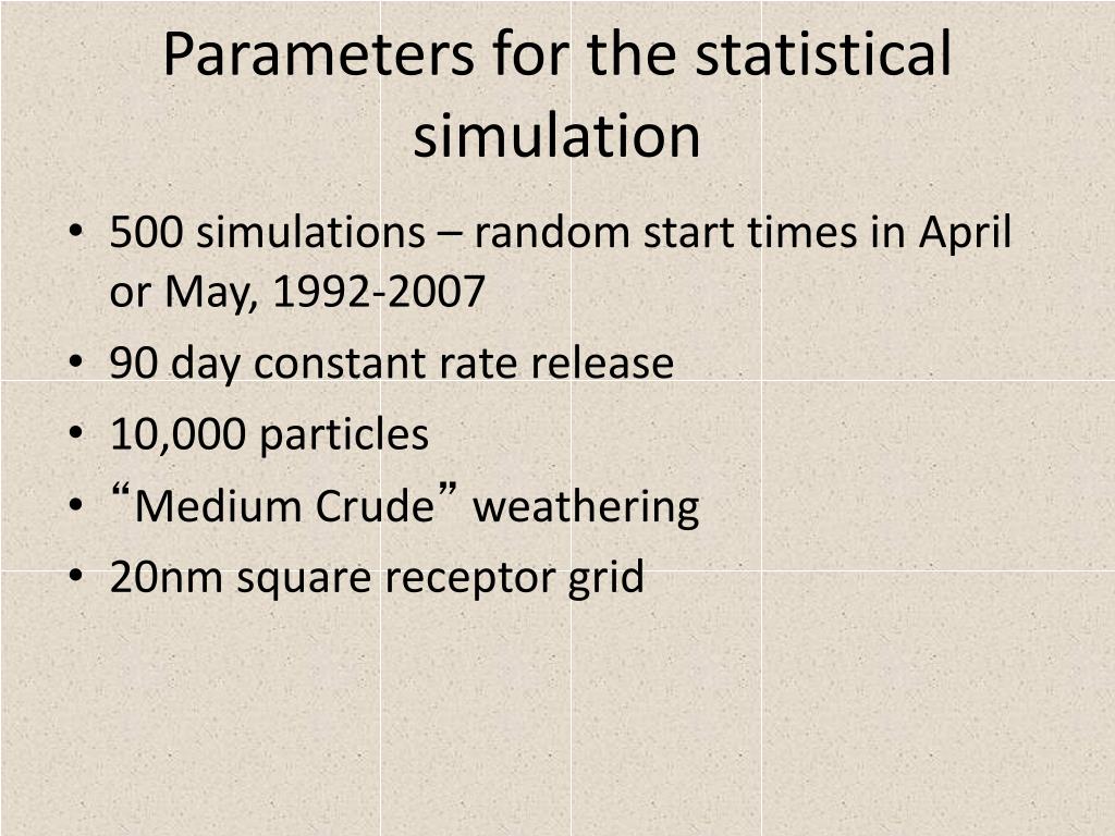 Parameters for the statistical simulation • 500 simulations – random start times in April or May, 1992-2007 • 90 day constant rate release • 10,000 particles • “Medium Crude” weathering • 20nm square receptor grid