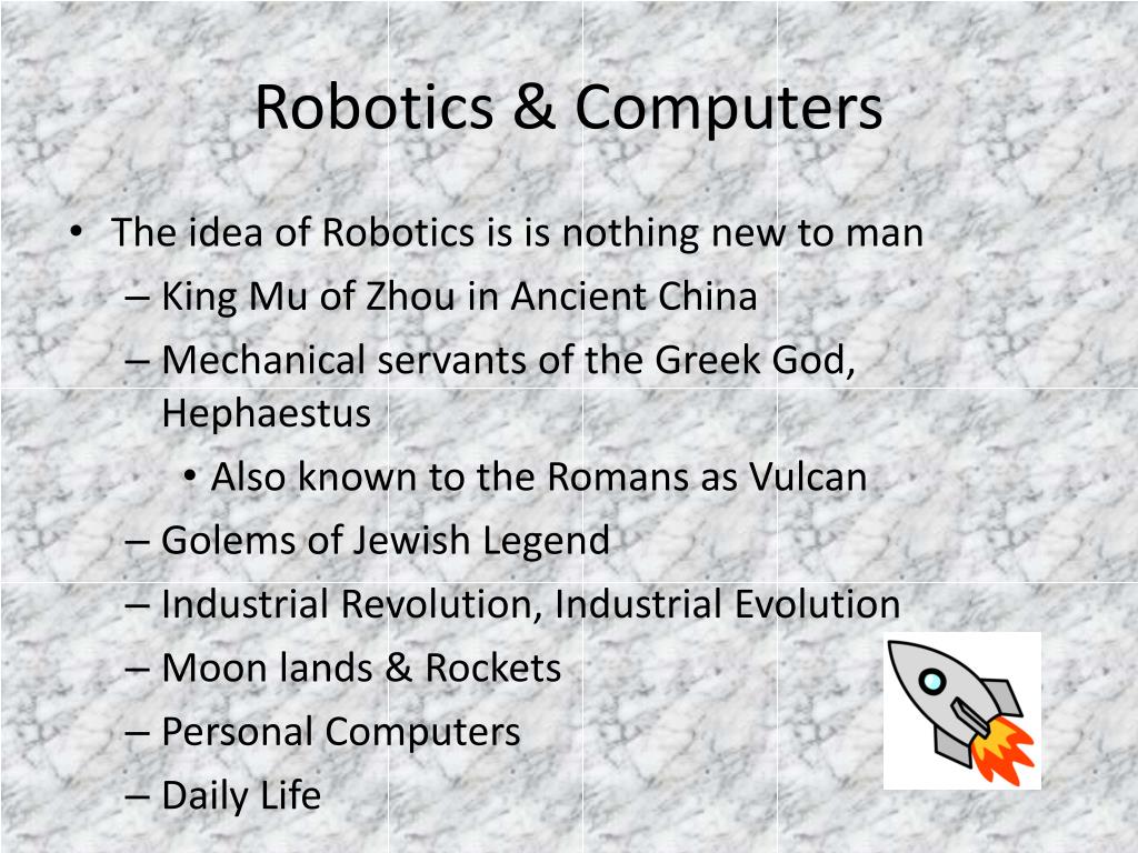 Robotics & Computers • The idea of Robotics is is nothing new to man • King Mu of Zhou in Ancient China • Mechanical servants of the Greek God, Hephaestus • Also known to the Romans as Vulcan • Golems of Jewish Legend • Industrial Revolution, Industrial Evolution • Moon lands & Rockets • Personal Computers • Daily Life