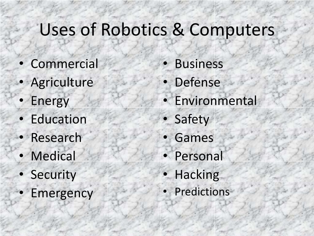 Uses of Robotics & Computers • Commercial • Agriculture • Energy • Education • Research • Medical • Security • Emergency • Business • Defense • Environmental • Safety • Games • Personal • Hacking • Predictions