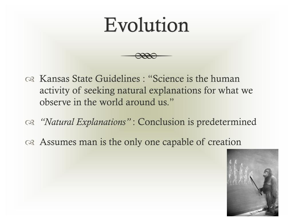 Evolution Kansas State Guidelines : “Science is the human activity of seeking natural explanations for what we observe in the world around us.” “Natural Explanations” : Conclusion is predetermined Assumes man is the only one capable of creation