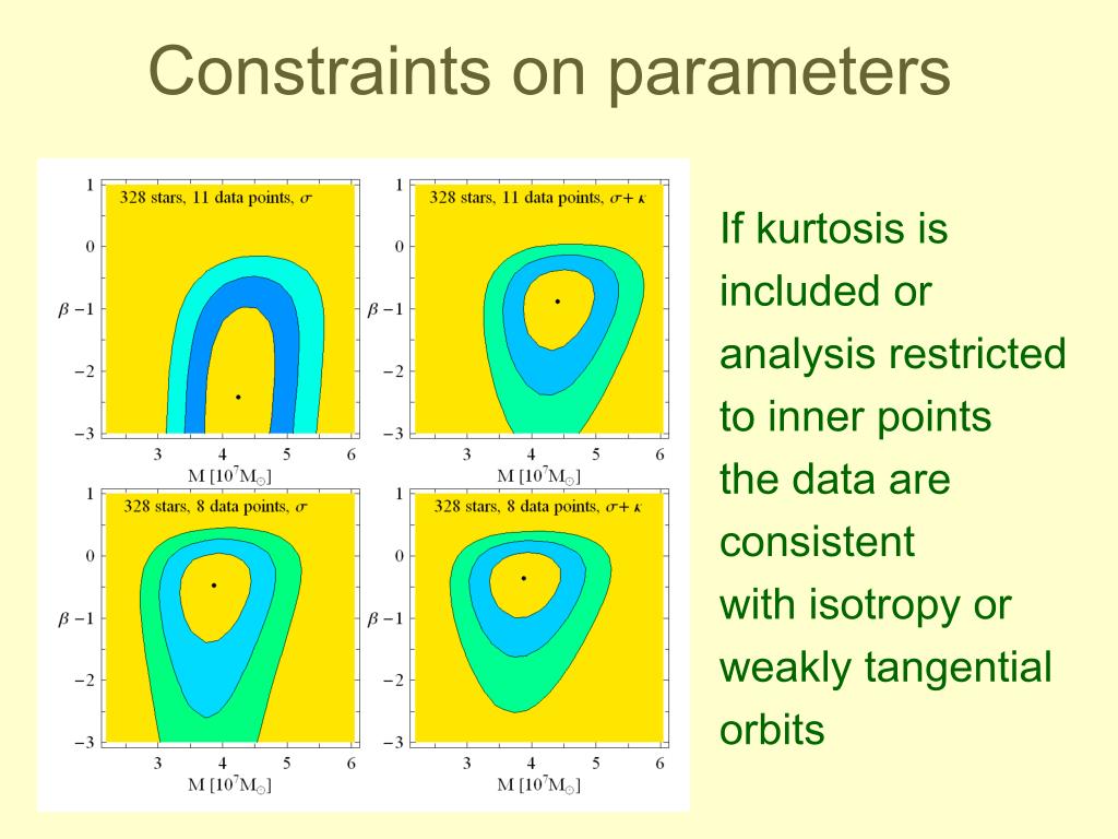 Constraints on parameters If kurtosis is included or analysis restricted to inner points the data are consistent with isotropy or weakly tangential orbits
