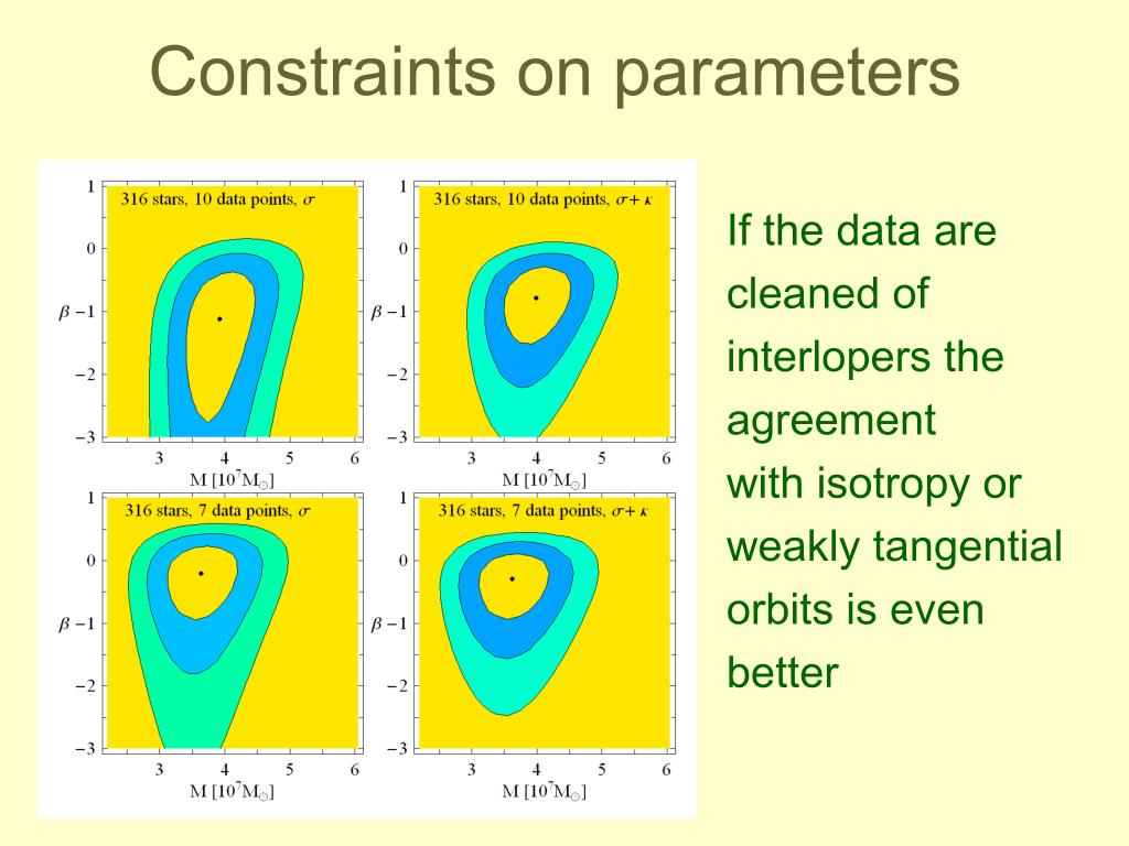 Constraints on parameters If the data are cleaned of interlopers the agreement with isotropy or weakly tangential orbits is even better