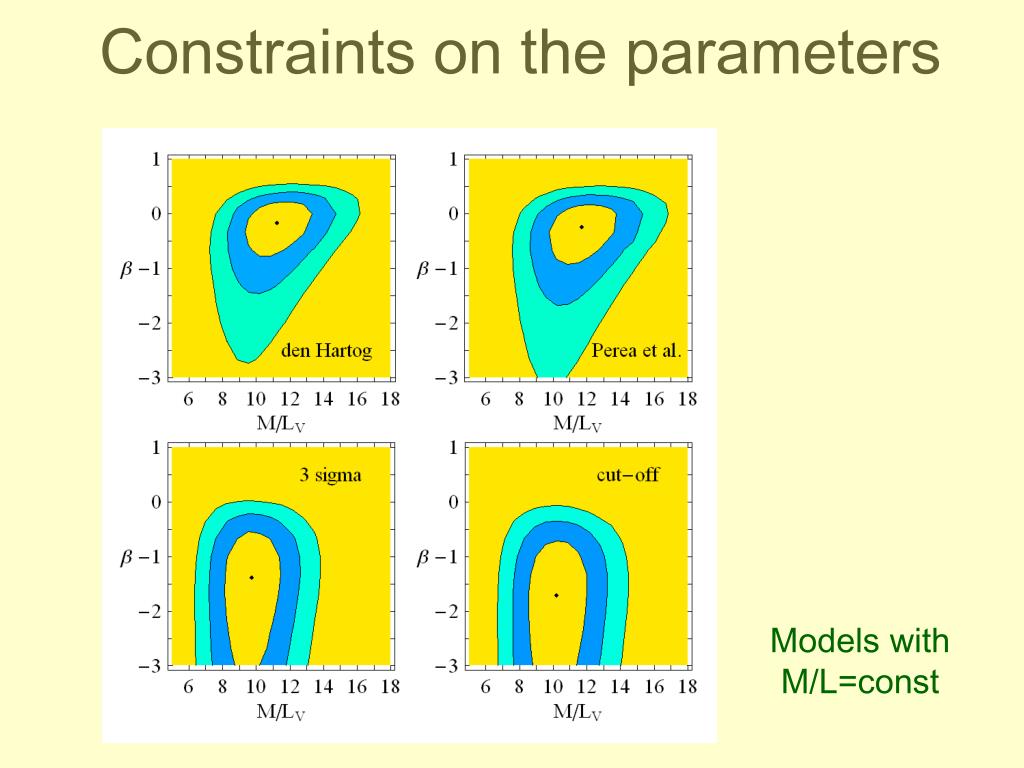 Additional constraints from kurtosis σlosσlos + κlos M/LV =11.3 M/L β= –0.17 χ2/N=3.4/4 M/LV =11.4 M/L β= –0.03 χ2/N=10.9/10