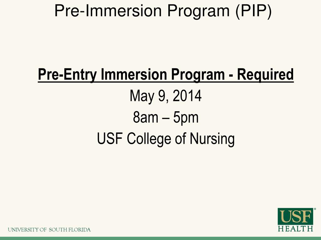Pre-Immersion Program (PIP) Pre-Entry Immersion Program - Required May 9, 2014 8am – 5pm USF College of Nursing