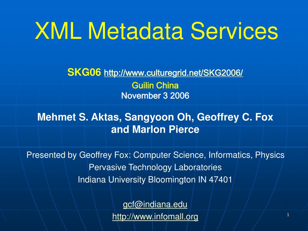 XML Metadata Services. SKG06 http://www.culturegrid.net/SKG2006/ Guilin China November 3 2006 Mehmet S. Aktas, Sangyoon Oh, Geoffrey C. Fox and Marlon Pierce Presented by Geoffrey Fox: Computer Science, Informatics, Physics Pervasive Technology Laboratories