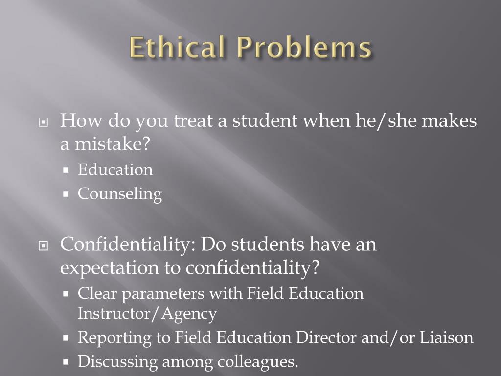 Ethical Problems • How do you treat a student when he/she makes a mistake? • Education • Counseling • Confidentiality: Do students have an expectation to confidentiality? • Clear parameters with Field Education Instructor/Agency • Reporting to Field Education Directorand/or Liaison • Discussing among colleagues.