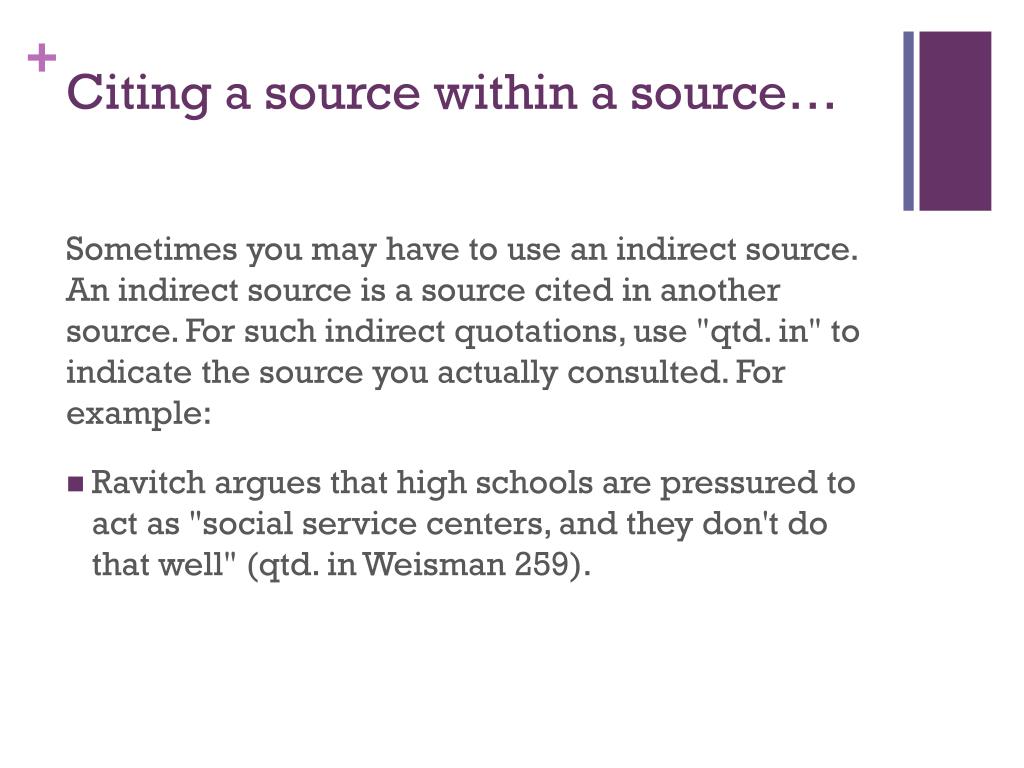 Citing a source within a source… Sometimes you may have to use an indirect source. An indirect source is a source cited in another source. For such indirect quotations, use "qtd. in" to indicate the source you actually consulted. For example: • Ravitch argues that high schools are pressured to act as "social service centers, and they don't do that well" (qtd. in Weisman 259).