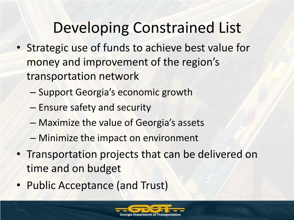 Developing Constrained List • Strategic use of funds to achieve best value for money and improvement of the region’s transportation network • Support Georgia’s economic growth • Ensure safety and security • Maximize the value of Georgia’s assets • Minimize the impact on environment • Transportation projects that can be delivered on time and on budget • Public Acceptance (and Trust)