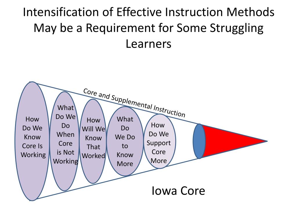 Intensification of Effective Instruction Methods May be a Requirement for Some Struggling Learners Core and Supplemental Instruction What Do We Do When Core is Not Working What Do We Do to Know More How Do We Know Core Is Working How Will We Know That Worked How Do We Support Core More • Iowa Core