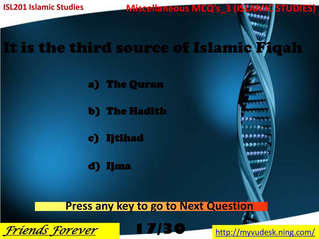 ISL201 Islamic Studies Miscellaneous MCQ’s_3 (ISLAMIC STUDIES) It is the third source of Islamic Fiqah The Quran The Hadith Ijtihad Ijma Press any key to go to Next Question 17/30 Friends Forever http://myvudesk.ning.com/