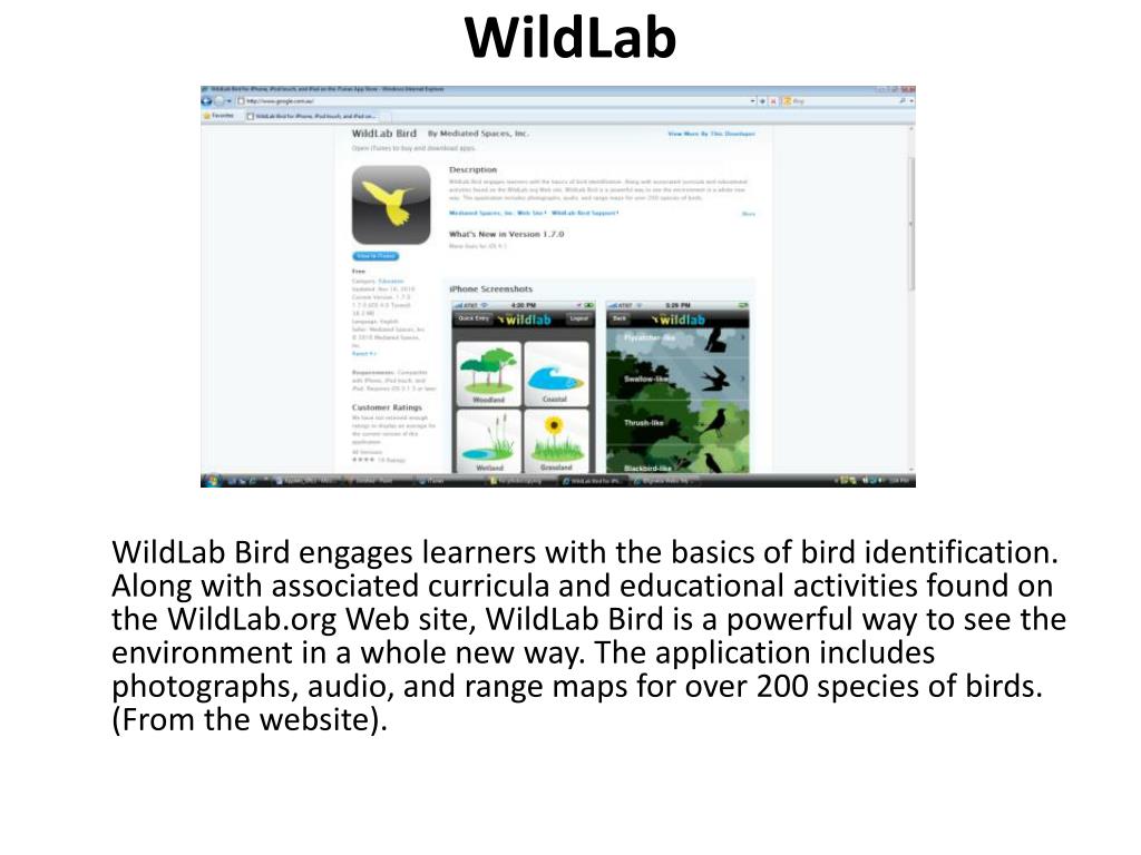 WildLab WildLab Bird engages learners with the basics of bird identification. Along with associated curricula and educational activities found on the WildLab.org Web site, WildLab Bird is a powerful way to see the environment in a whole new way. The application includes photographs, audio, and range maps for over 200 species of birds. (From the website).