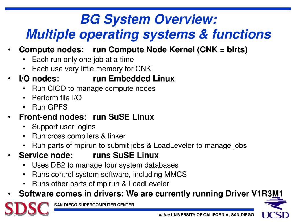 Running on the SDSC Blue Gene. Mahidhar Tatineni Blue Gene Workshop SDSC, April 5, 2007. BG System Overview: SDSC’s three-rack system . BG System Overview: Integrated system. BG System Overview: Multiple operating systems & functions. Compute nodes: run Compute Node Kernel (CNK = blrts)