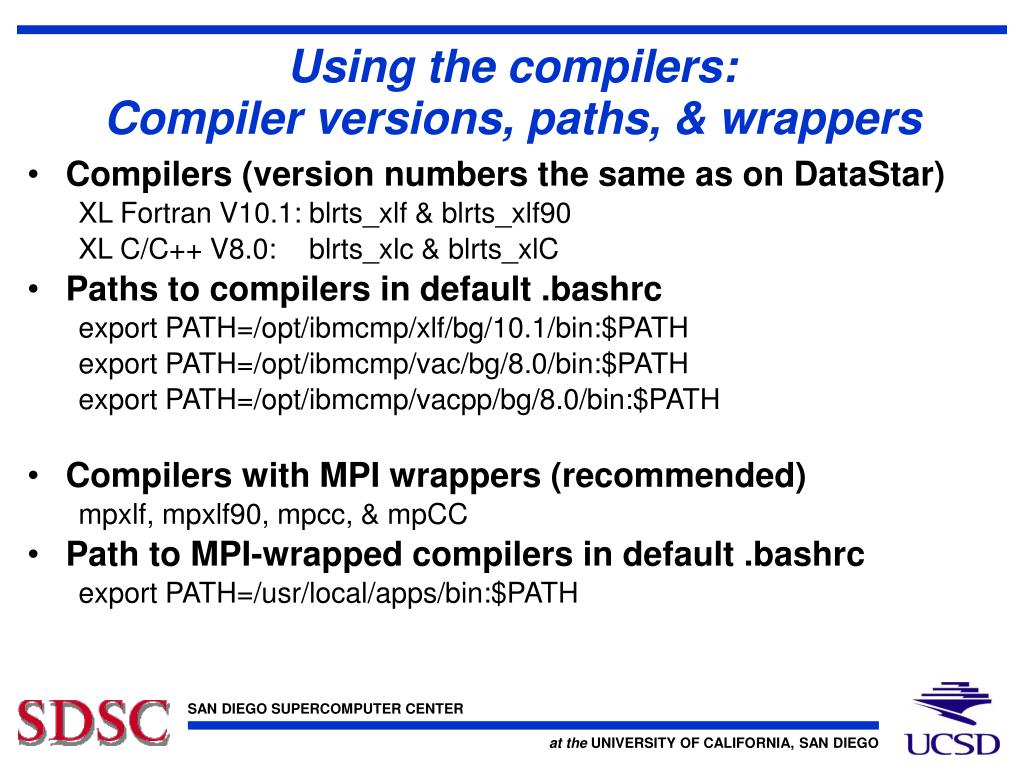 Using the compilers:Compiler versions, paths, & wrappers • Compilers (version numbers the same as on DataStar) XL Fortran V10.1: blrts_xlf & blrts_xlf90 XL C/C++ V8.0: blrts_xlc & blrts_xlC • Paths to compilers in default .bashrc export PATH=/opt/ibmcmp/xlf/bg/10.1/bin:$PATH export PATH=/opt/ibmcmp/vac/bg/8.0/bin:$PATH export PATH=/opt/ibmcmp/vacpp/bg/8.0/bin:$PATH • Compilers with MPI wrappers (recommended) mpxlf, mpxlf90, mpcc, & mpCC • Path to MPI-wrapped compilers in default .bashrc export PATH=/usr/local/apps/bin:$PATH