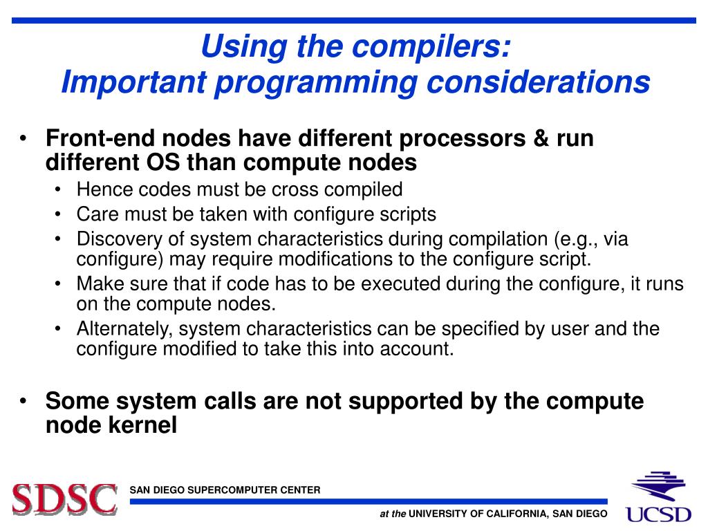 Using the compilers:Important programming considerations • Front-end nodes have different processors & run different OS than compute nodes • Hence codes must be cross compiled • Care must be taken with configure scripts • Discovery of system characteristics during compilation (e.g., via configure) may require modifications to the configure script. • Make sure that if code has to be executed during the configure, it runs on the compute nodes. • Alternately, system characteristics can be specified by user and the configure modified to take this into account. • Some system calls are not supported by the compute node kernel