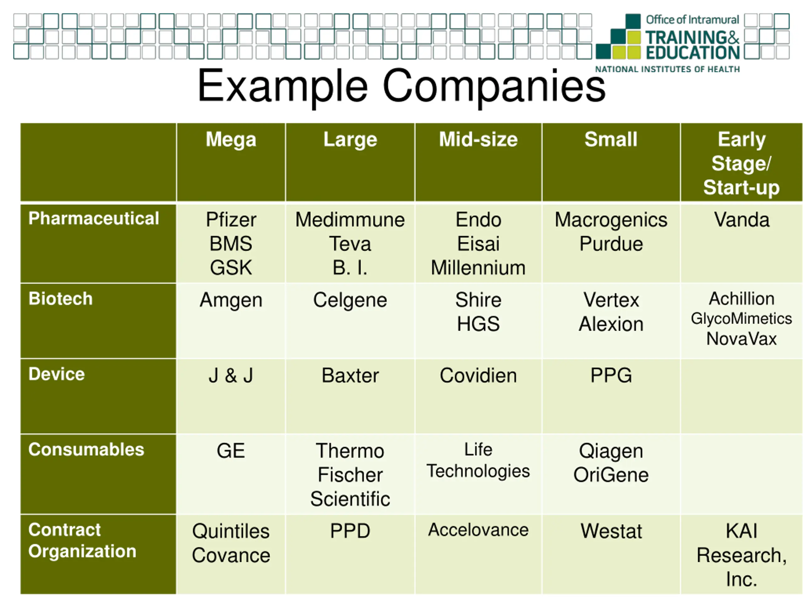 Example Companies Mega Large Mid-size Small Early Stage/ Start-up Vanda Pfizer BMS GSK Amgen Medimmune Teva B. I. Celgene Endo Eisai Millennium Shire HGS Macrogenics Purdue Pharmaceutical Vertex Alexion Achillion GlycoMimetics NovaVax Biotech J & J Baxter Covidien PPG Device GE Thermo Fischer Scientific PPD Qiagen OriGene Life Consumables Technologies Quintiles Covance Westat KAI Accelovance Contract Organization Research, Inc.