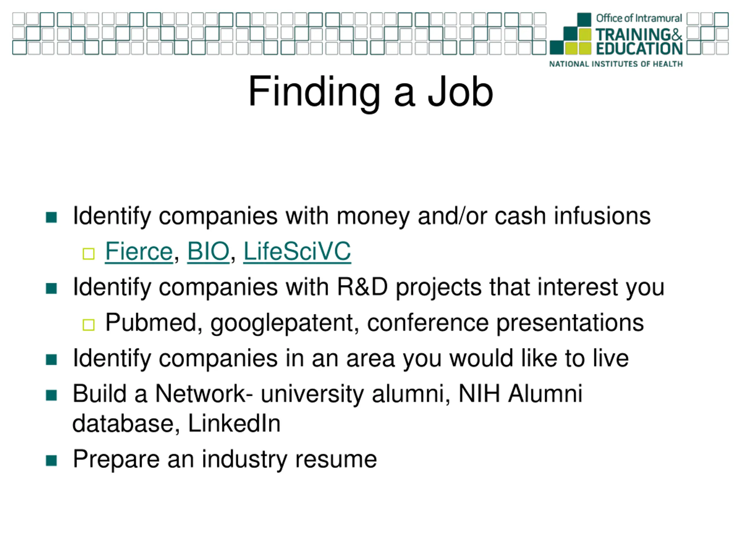 Finding a Job Identify companies with money and/or cash infusions Fierce, BIO, LifeSciVC Identify companies with R&D projects that interest you Pubmed, googlepatent, conference presentations Identify companies in an area you would like to live Build a Network- university alumni, NIH Alumni database, LinkedIn Prepare an industry resume