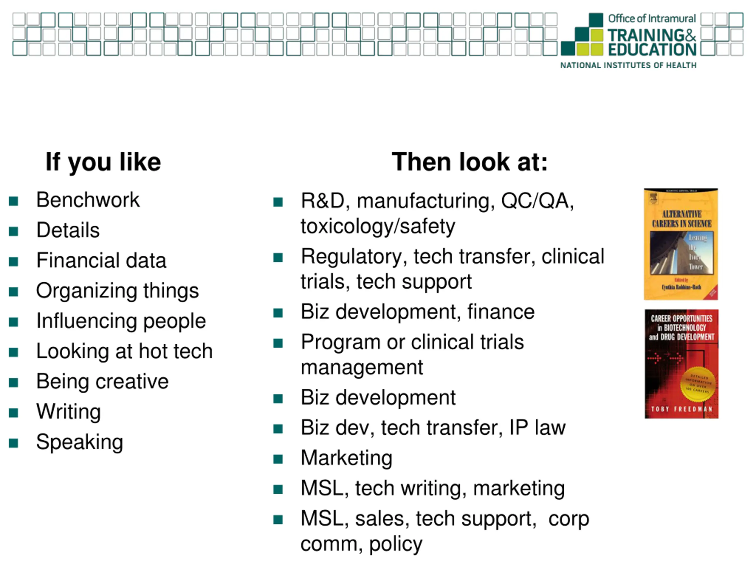 If you like Then look at: Benchwork Details Financial data Organizing things Influencing people Looking at hot tech Being creative Writing Speaking R&D, manufacturing, QC/QA, toxicology/safety Regulatory, tech transfer, clinical trials, tech support Biz development, finance Program or clinical trials management Biz development Biz dev, tech transfer, IP law Marketing MSL, tech writing, marketing MSL, sales, tech support, corp comm, policy