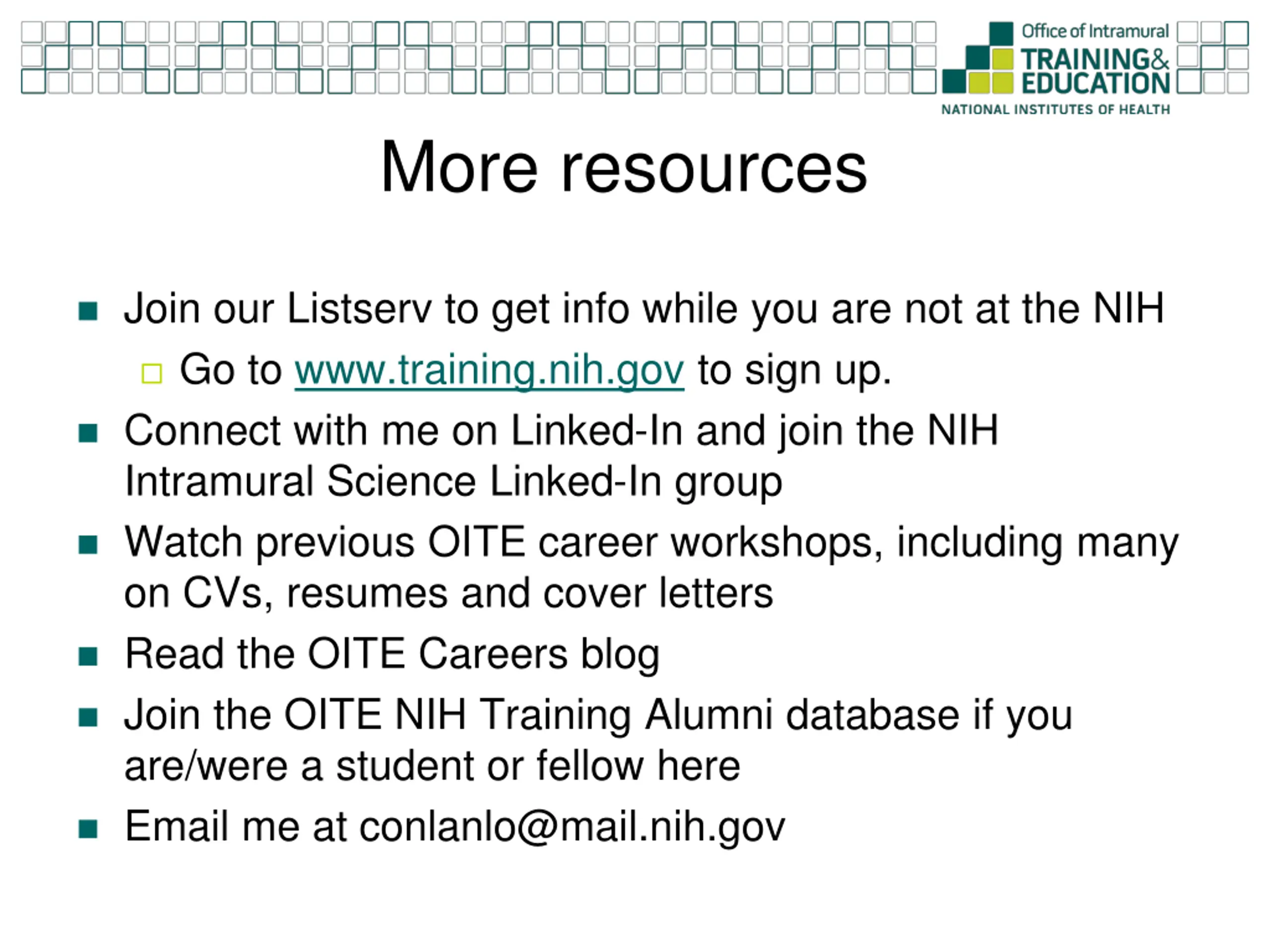 More resources Join our Listserv to get info while you are not at the NIH Go to www.training.nih.gov to sign up. Connect with me on Linked-In and join the NIH Intramural Science Linked-In group Watch previous OITE career workshops, including many on CVs, resumes and cover letters Read the OITE Careers blog Join the OITE NIH Training Alumni database if you are/were a student or fellow here Email me at conlanlo@mail.nih.gov