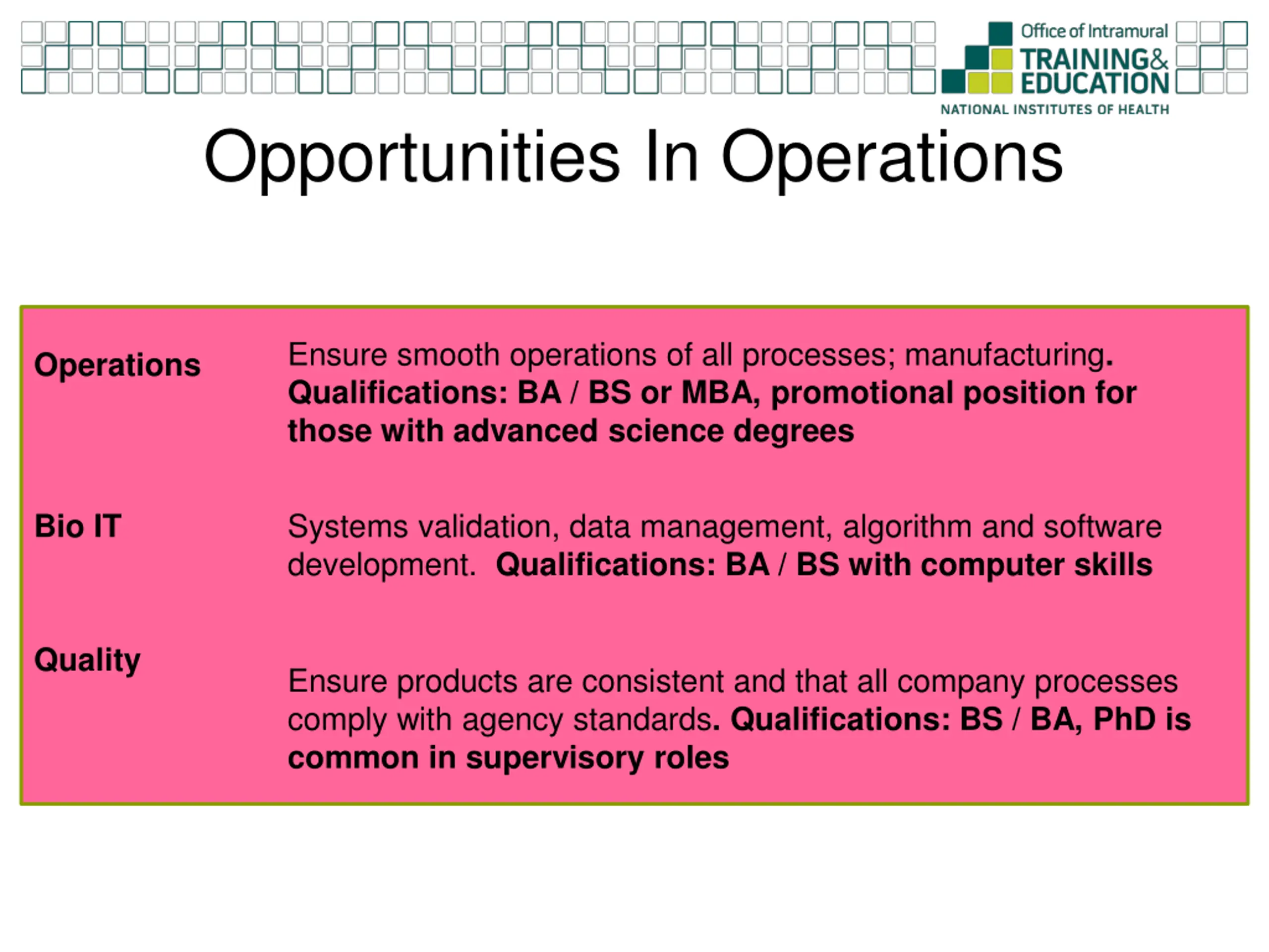 Opportunities In Operations Ensure smooth operations of all processes; manufacturing. Qualifications: BA / BS or MBA, promotional position for those with advanced science degrees Operations Systems validation, data management, algorithm and software development. Qualifications: BA / BS with computer skills Bio IT Quality Ensure products are consistent and that all company processes comply with agency standards. Qualifications: BS / BA, PhD is common in supervisory roles