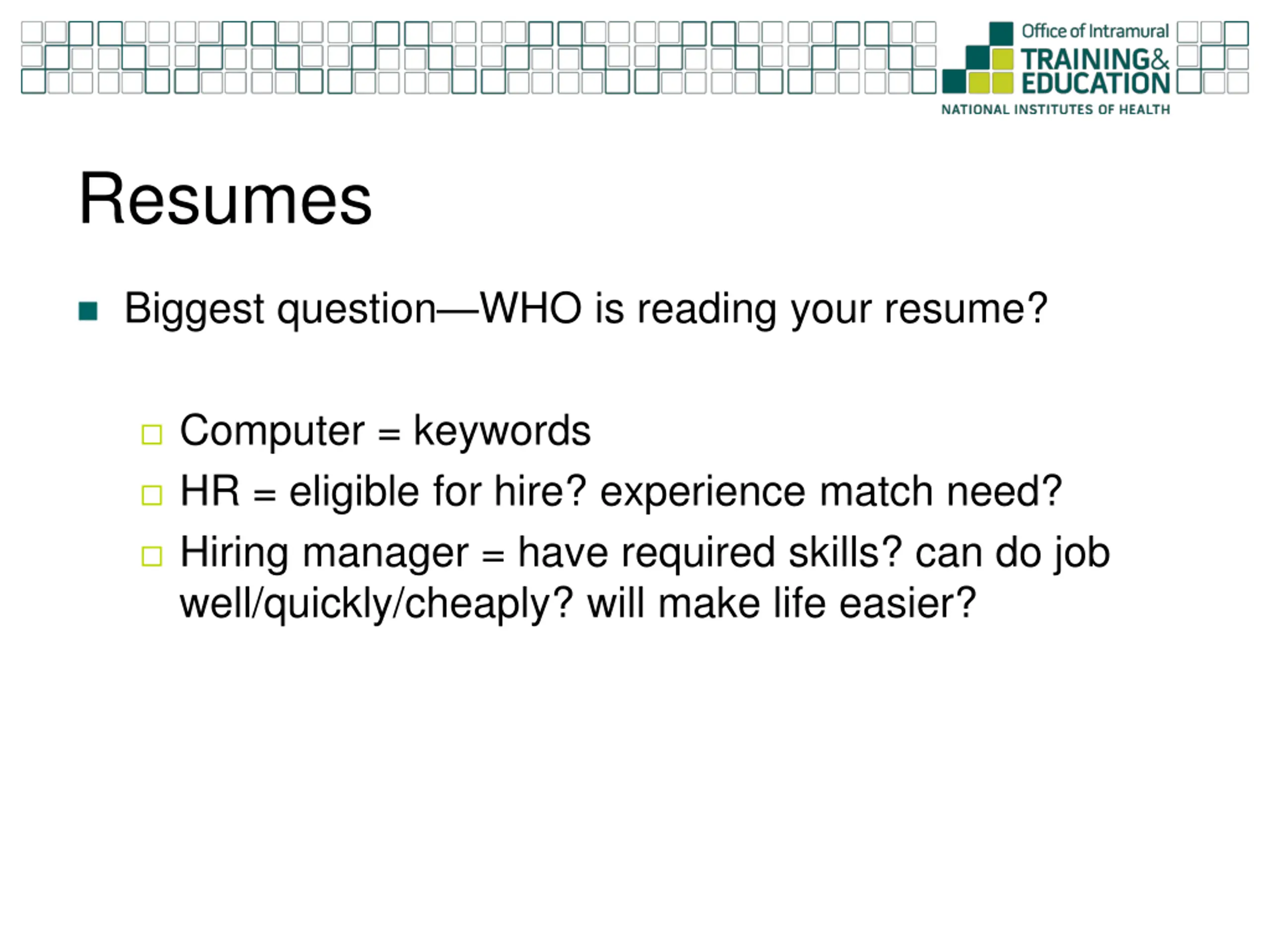 Resumes Biggest question—WHO is reading your resume? Computer = keywords HR = eligible for hire? experience match need? Hiring manager = have required skills? can do job well/quickly/cheaply? will make life easier?