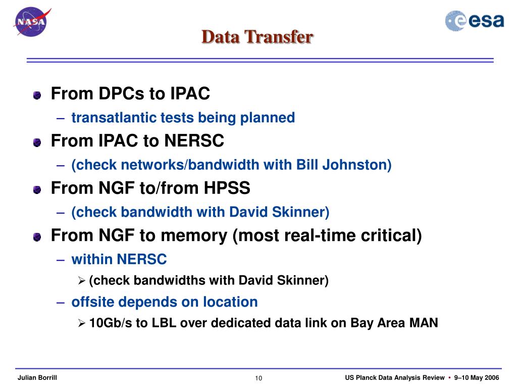 Data Transfer • From DPCs to IPAC • transatlantic tests being planned • From IPAC to NERSC • (check networks/bandwidth with Bill Johnston) • From NGF to/from HPSS • (check bandwidth with David Skinner) • From NGF to memory (most real-time critical) • within NERSC • (check bandwidths with David Skinner) • offsite depends on location • 10Gb/s to LBL over dedicated data link on Bay Area MAN