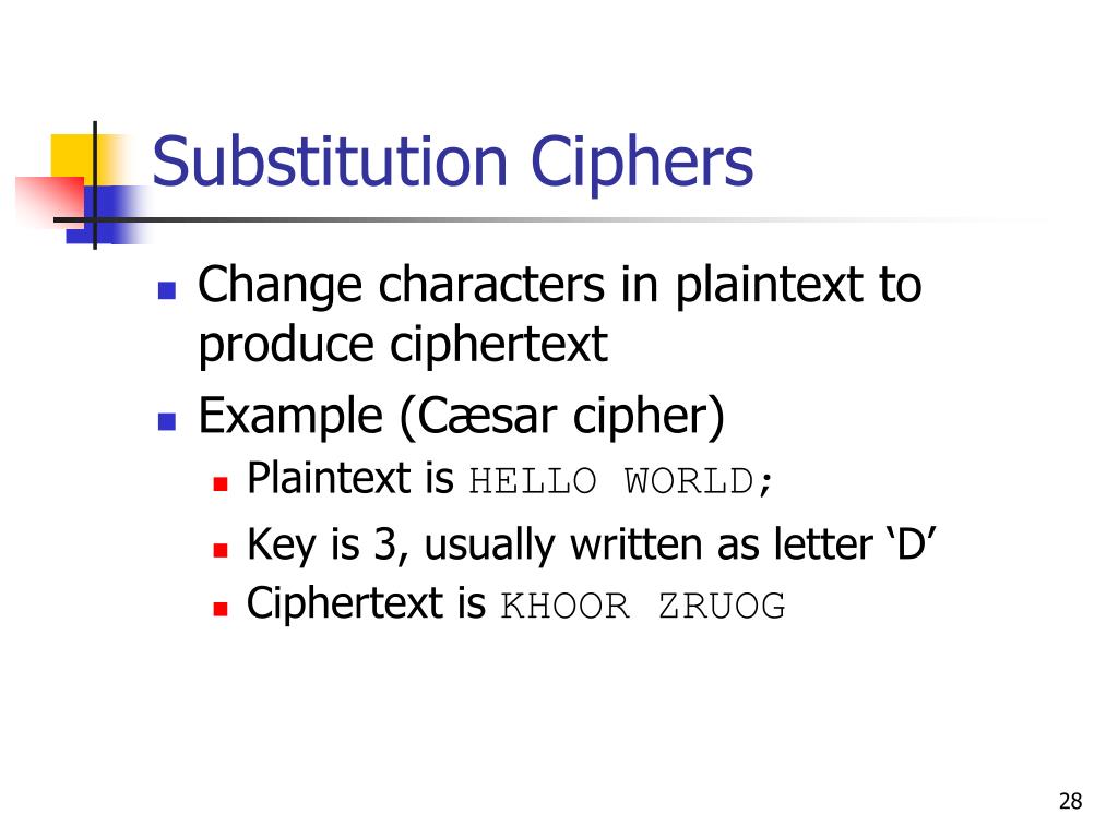 Substitution Ciphers • Change characters in plaintext to produce ciphertext • Example (Cæsar cipher) • Plaintext is HELLO WORLD; • Key is 3, usually written as letter ‘D’ • Ciphertext is KHOOR ZRUOG