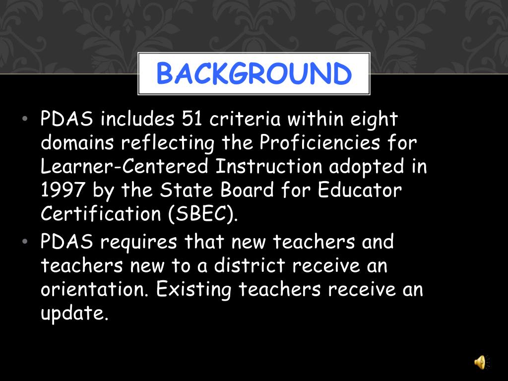 Background • PDAS includes 51 criteria within eight domains reflecting the Proficiencies for Learner-Centered Instruction adopted in 1997 by the State Board for Educator Certification (SBEC). • PDAS requires that new teachers and teachers new to a district receive an orientation. Existing teachers receive an update.
