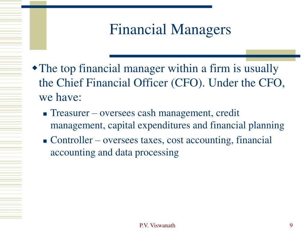 Financial Managers • The top financial manager within a firm is usually the Chief Financial Officer (CFO). Under the CFO, we have: • Treasurer – oversees cash management, credit management, capital expenditures and financial planning • Controller – oversees taxes, cost accounting, financial accounting and data processing P.V. Viswanath