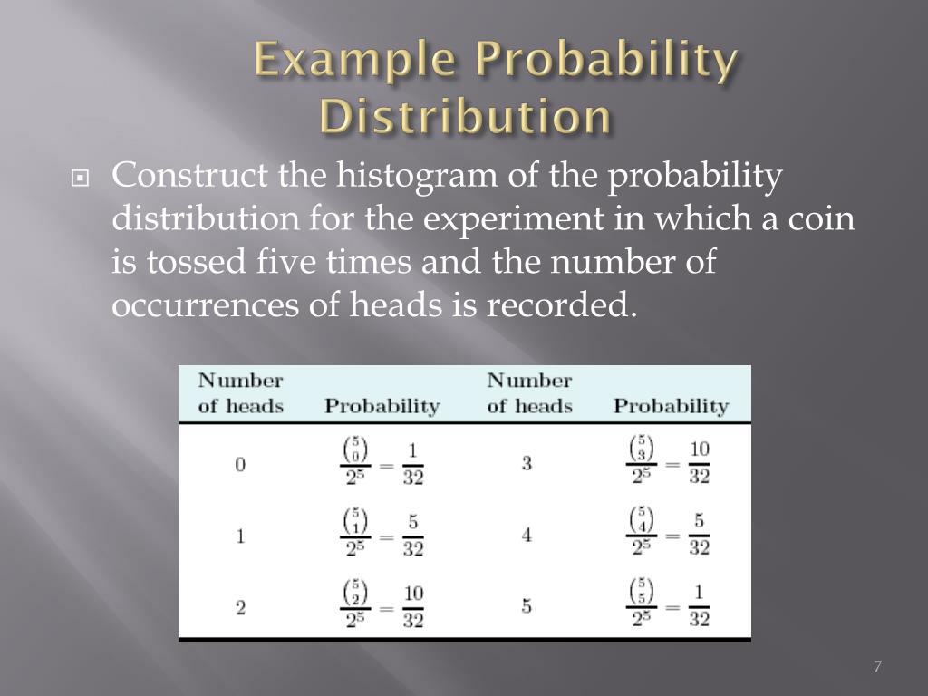 Example Probability Distribution • Construct the histogram of the probability distribution for the experiment in which a coin is tossed five times and the number of occurrences of heads is recorded.