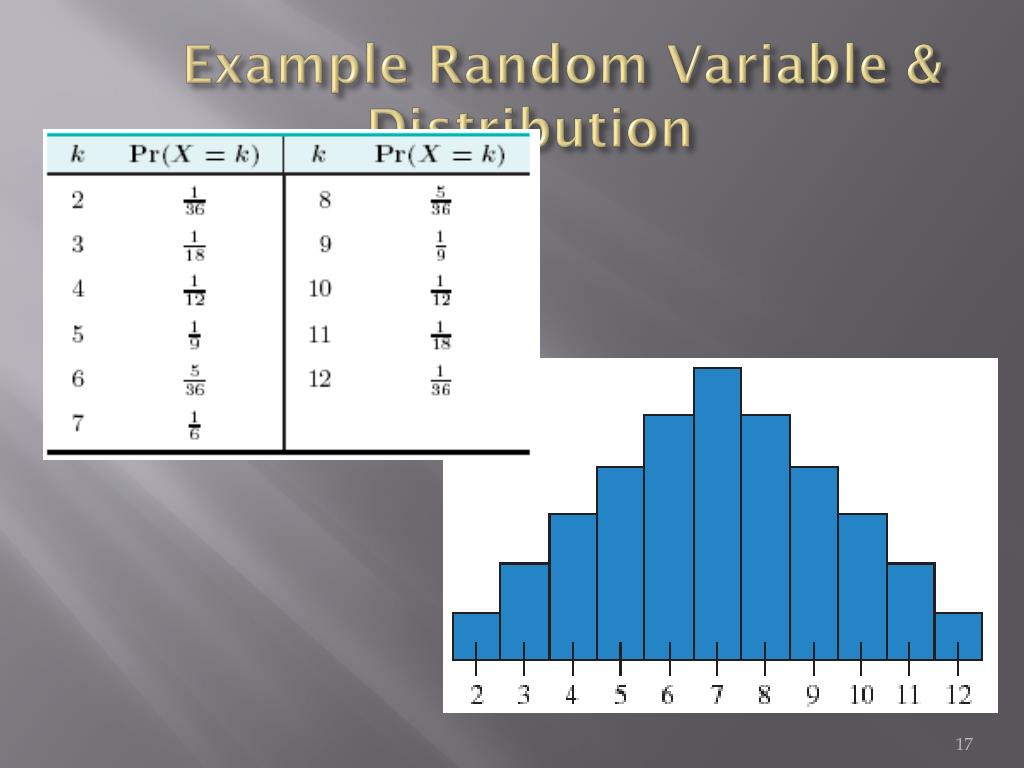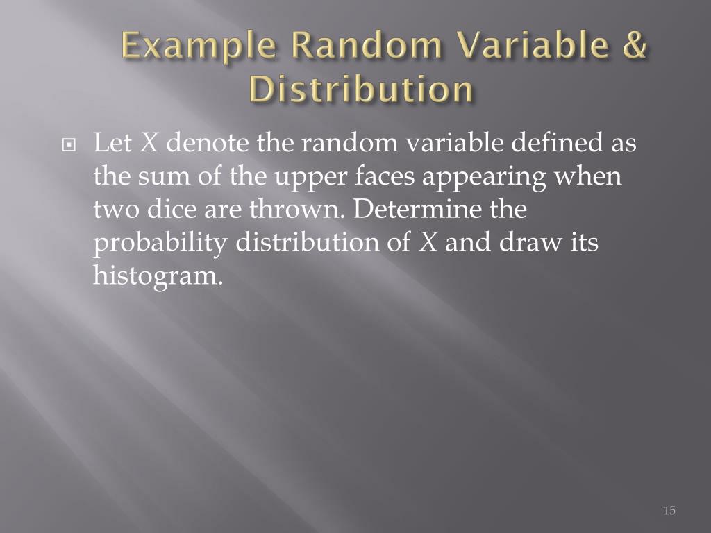 Example Random Variable & Distribution • Let X denote the random variable defined as the sum of the upper faces appearing when two dice are thrown. Determine the probability distribution of X and draw its histogram.
