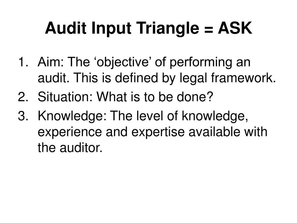 Audit Input Triangle = ASK • Aim: The ‘objective’ of performing an audit. This is defined by legal framework. • Situation: What is to be done? • Knowledge: The level of knowledge, experience and expertise available with the auditor.