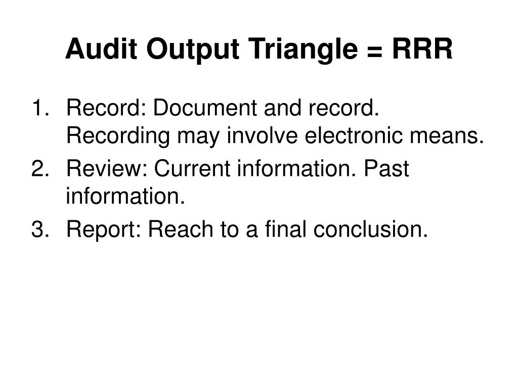 Audit Output Triangle = RRR • Record: Document and record. Recording may involve electronic means. • Review: Current information. Past information. • Report: Reach to a final conclusion.