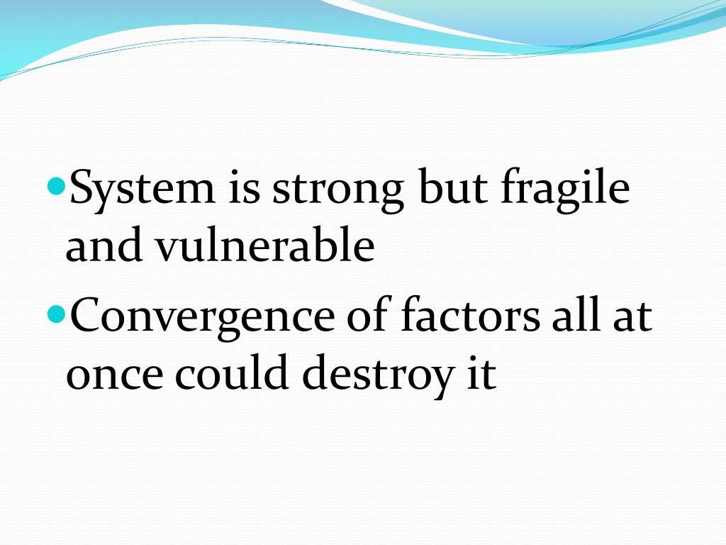 System is strong but fragile and vulnerable • Convergence of factors all at once could destroy it