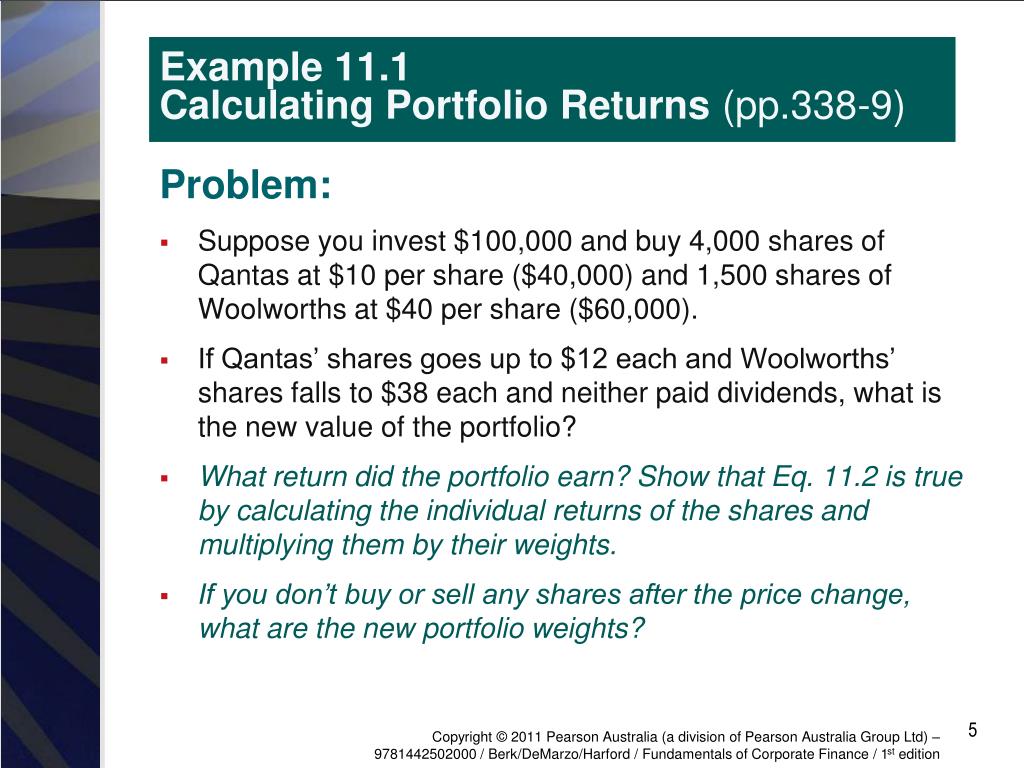 11.1 The Expected Return of a Portfolio • Portfolio returns • The return on a portfolio, Rp, is the weighted average of the returns on the investments in the portfolio, where the weights correspond to portfolio weights: (Eq. 11.2) FORMULA! 4