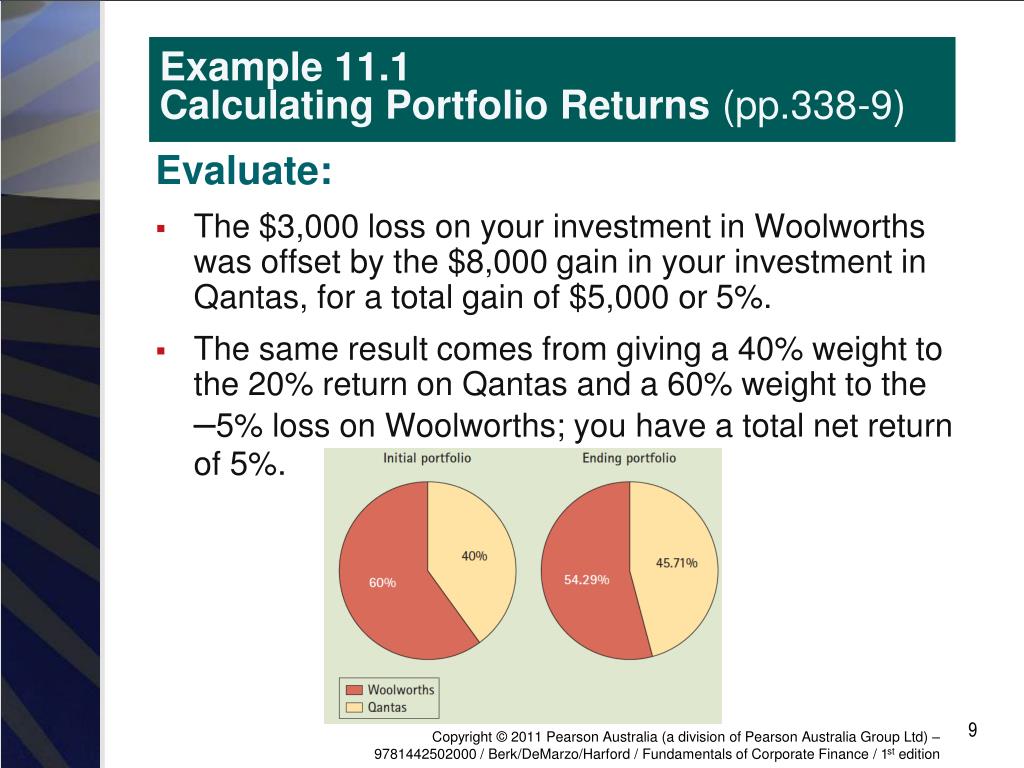 Example 11.1 Calculating Portfolio Returns (pp.338-9) Evaluate: • The $3,000 loss on your investment in Woolworths was offset by the $8,000 gain in your investment in Qantas, for a total gain of $5,000 or 5%. • The same result comes from giving a 40% weight to the 20% return on Qantas and a 60% weight to the –5% loss on Woolworths; you have a total net return of 5%. 9