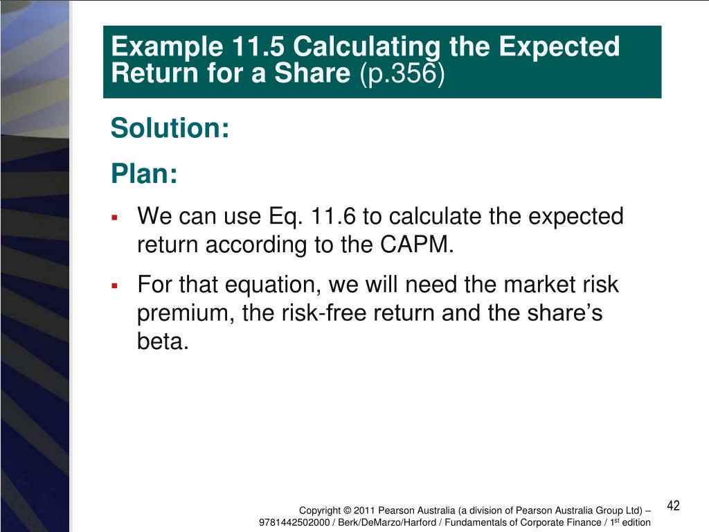 Example 11.5 Calculating the Expected Return for a Share (p.356) Problem: • Suppose the risk-free return is 5% and you measure the market risk premium to be 7%. • Qantas has a beta of 1.33. • According to the CAPM, what is its expected return? 41