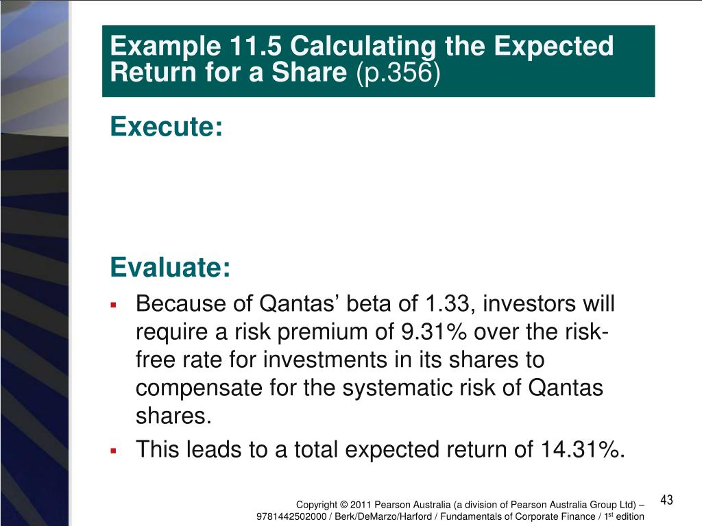 Example 11.5 Calculating the Expected Return for a Share (p.356) Execute: Evaluate: • Because of Qantas’ beta of 1.33, investors will require a risk premium of 9.31% over the risk-free rate for investments in its shares to compensate for the systematic risk of Qantas shares. • This leads to a total expected return of 14.31%. 43