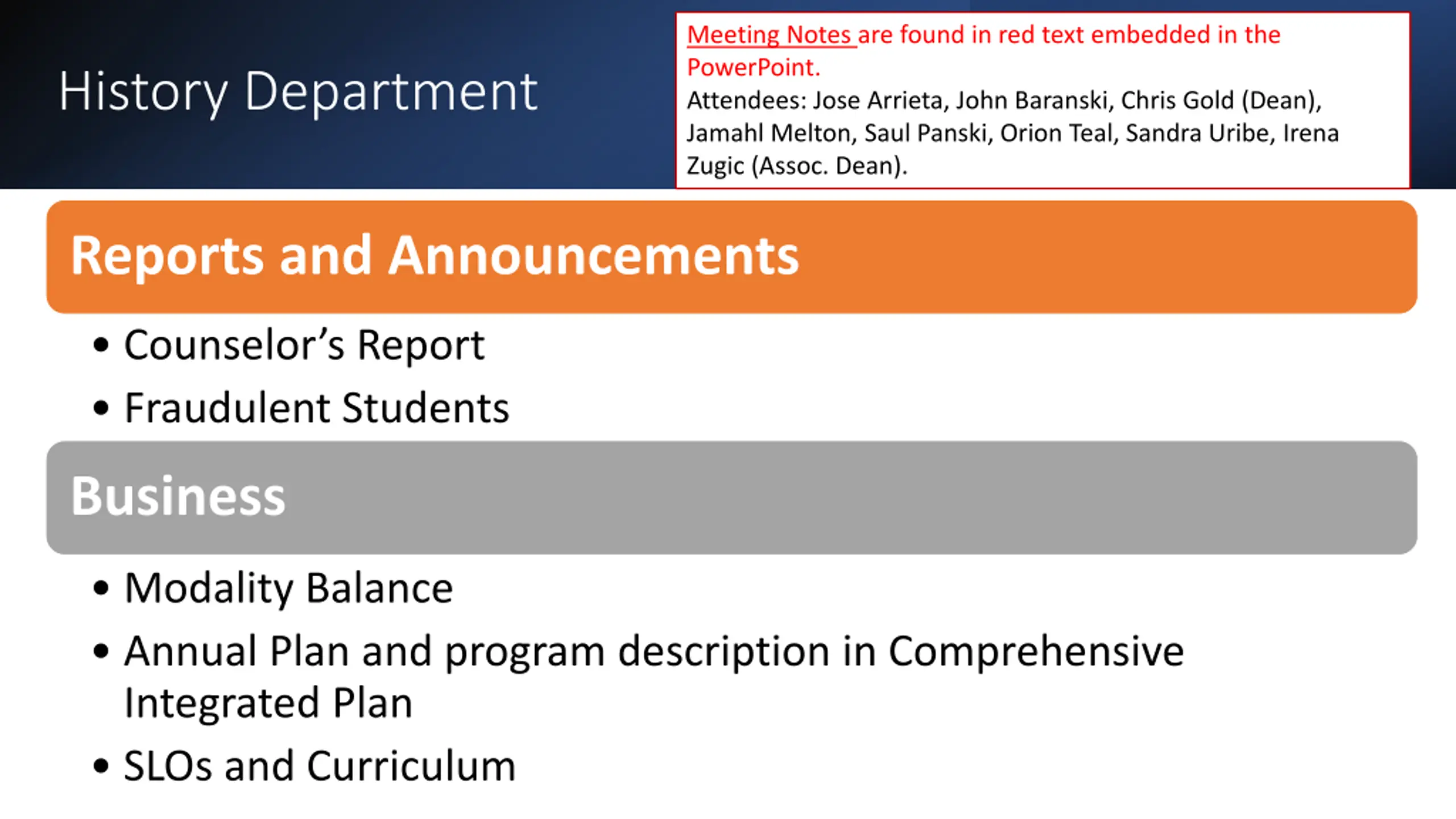 Meeting Notes are found in red text embedded in the PowerPoint. Attendees: Jose Arrieta, John Baranski, Chris Gold (Dean), Jamahl Melton, Saul Panski, Orion Teal, Sandra Uribe, Irena Zugic (Assoc. Dean). History Department Reports and Announcements • Counselor’s Report • Fraudulent Students Business • Modality Balance • Annual Plan and program description in Comprehensive Integrated Plan • SLOs and Curriculum