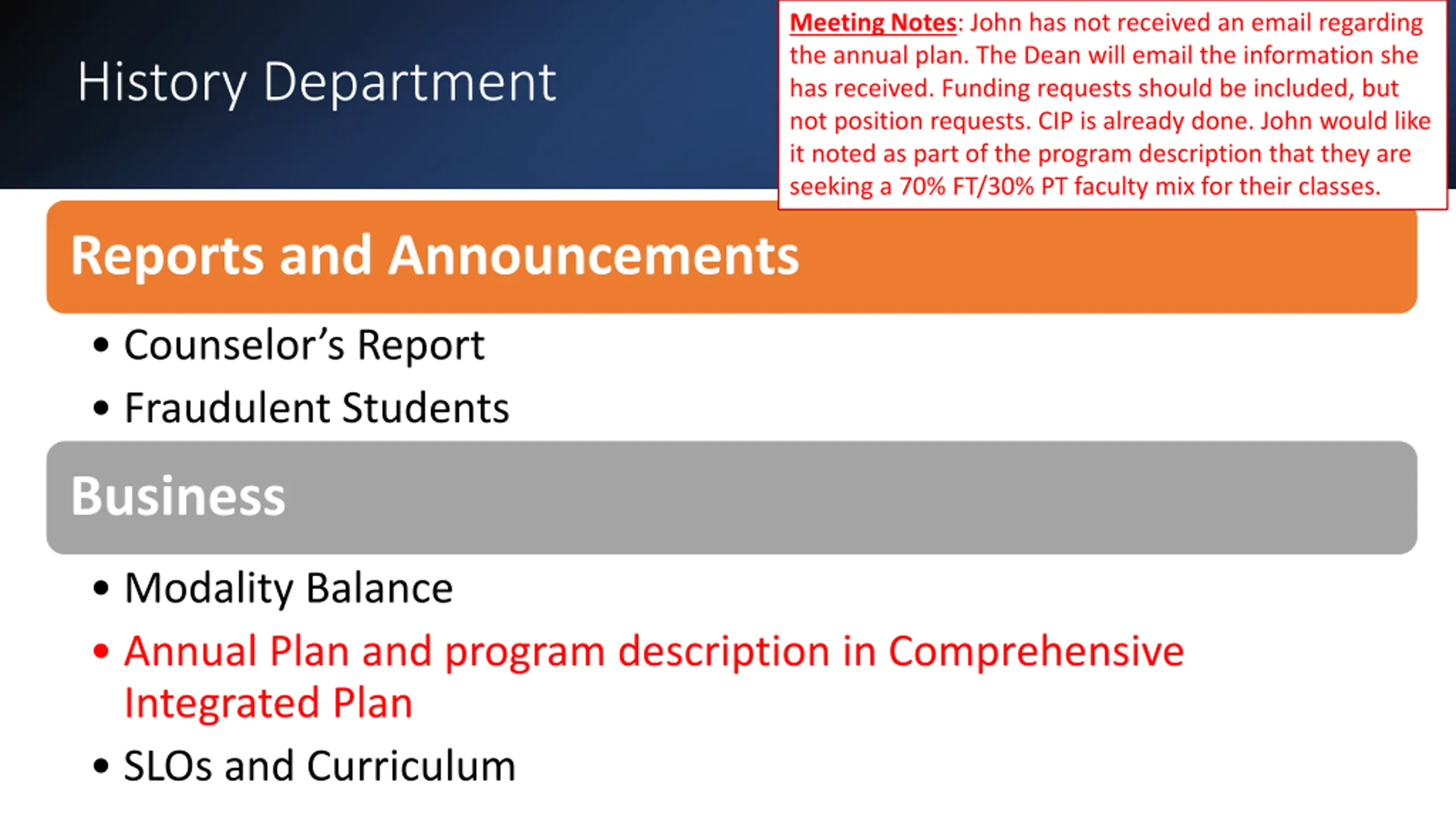 Meeting Notes: John has not received an email regarding the annual plan. The Dean will email the information she has received. Funding requests should be included, but not position requests. CIP is already done. John would like it noted as part of the program description that they are seeking a 70% FT/30% PT faculty mix for their classes. History Department Reports and Announcements • Counselor’s Report • Fraudulent Students Business • Modality Balance • Annual Plan and program description in Comprehensive Integrated Plan • SLOs and Curriculum