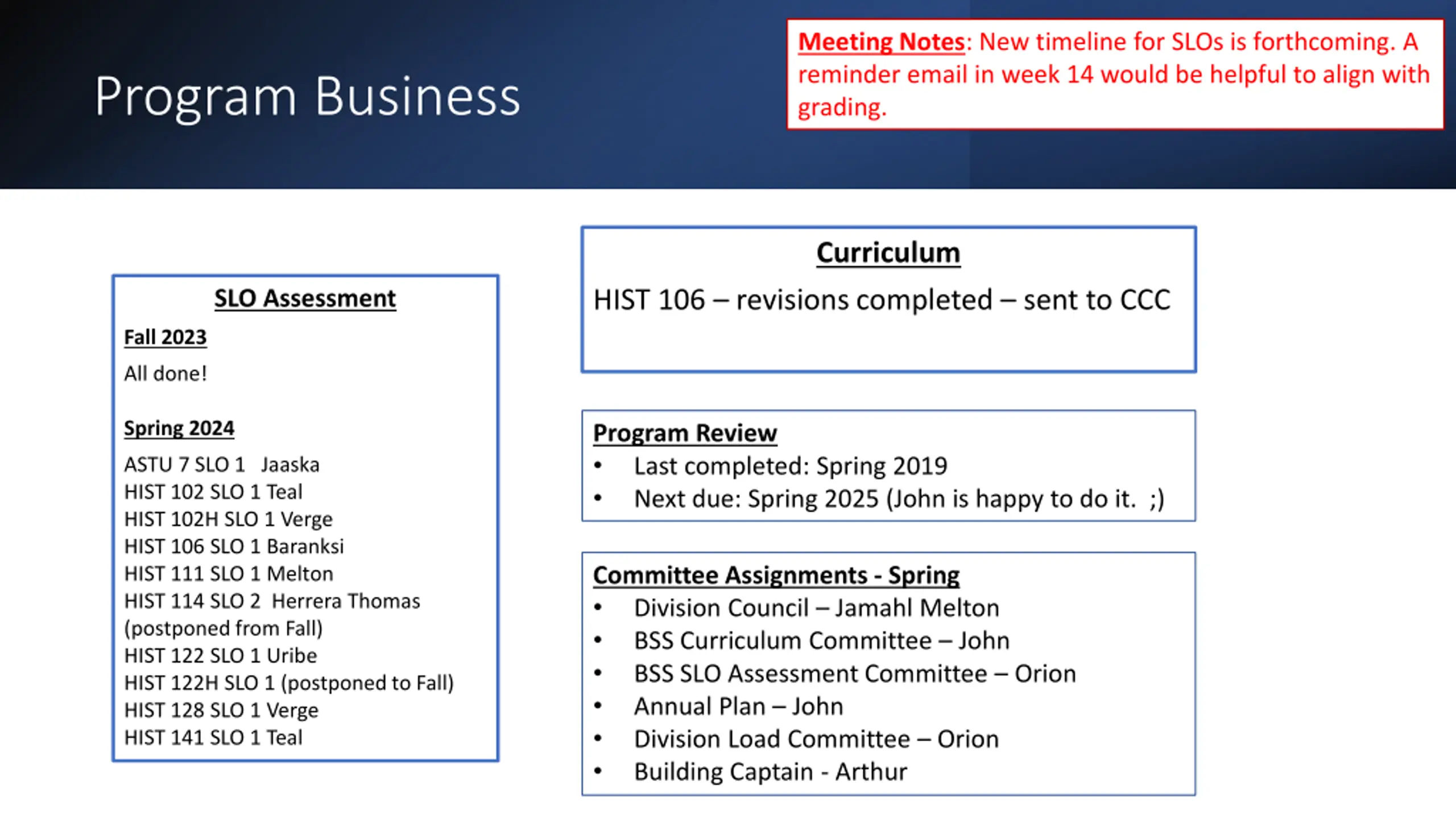 Meeting Notes: New timeline for SLOs is forthcoming. A reminder email in week 14 would be helpful to align with grading. Program Business Curriculum HIST 106 – revisions completed – sent to CCC SLO Assessment Fall 2023 All done! Spring 2024 Program Review • Last completed: Spring 2019 • Next due: Spring 2025 (John is happy to do it. ;) ASTU 7 SLO 1 Jaaska HIST 102 SLO 1 Teal HIST 102H SLO 1 Verge HIST 106 SLO 1 Baranksi HIST 111 SLO 1 Melton HIST 114 SLO 2 Herrera Thomas (postponed from Fall) HIST 122 SLO 1 Uribe HIST 122H SLO 1 (postponed to Fall) HIST 128 SLO 1 Verge HIST 141 SLO 1 Teal Committee Assignments - Spring • Division Council – Jamahl Melton • BSS Curriculum Committee – John • BSS SLO Assessment Committee – Orion • Annual Plan – John • Division Load Committee – Orion • Building Captain - Arthur