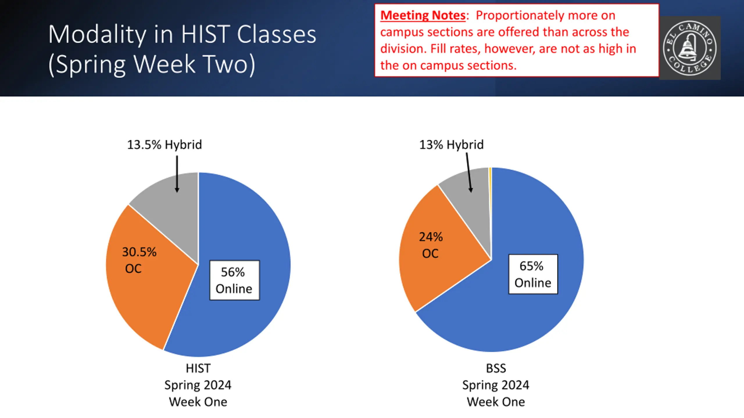 Meeting Notes: Proportionately more on campus sections are offered than across the division. Fill rates, however, are not as high in the on campus sections. Modality in HIST Classes (Spring Week Two) 13.5% Hybrid 13% Hybrid 24% OC 30.5% OC 65% Online 56% Online HIST BSS Spring 2024 Week One Spring 2024 Week One