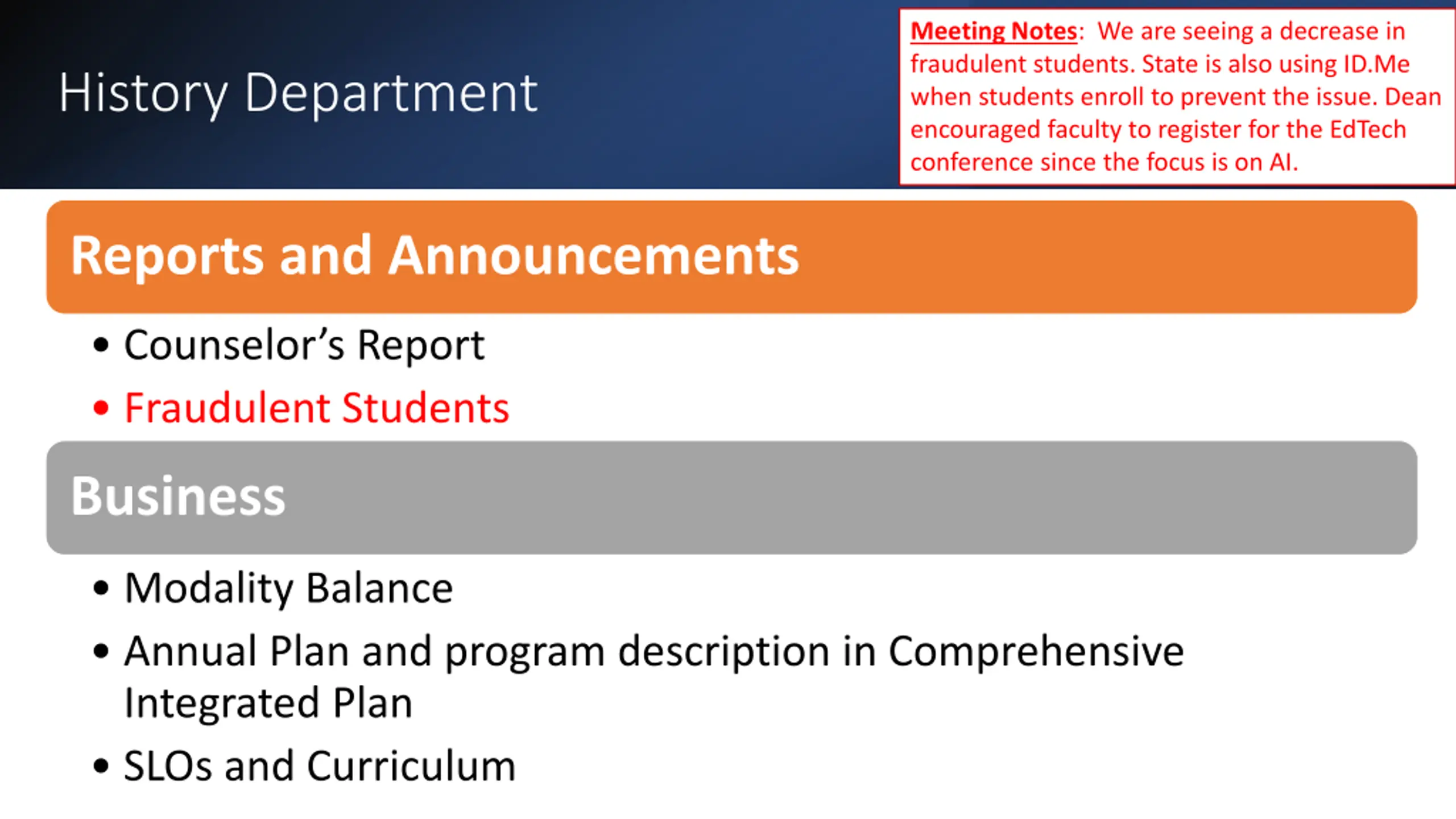 Meeting Notes: We are seeing a decrease in fraudulent students. State is also using ID.Me when students enroll to prevent the issue. Dean encouraged faculty to register for the EdTech conference since the focus is on AI. History Department Reports and Announcements • Counselor’s Report • Fraudulent Students Business • Modality Balance • Annual Plan and program description in Comprehensive Integrated Plan • SLOs and Curriculum