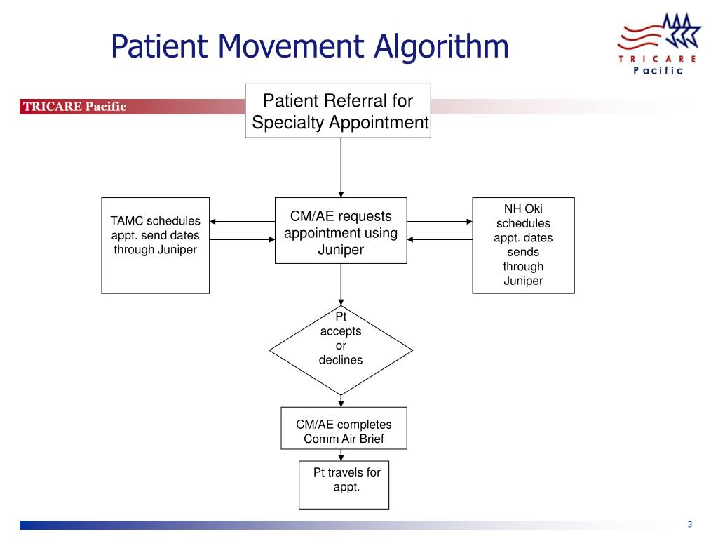 Patient Movement Algorithm Patient Referral for Specialty Appointment NH Oki schedules appt. dates sends through Juniper CM/AE requests appointment using Juniper TAMC schedules appt. send dates through Juniper Pt accepts or declines CM/AE completes Comm Air Brief Pt travels for appt.