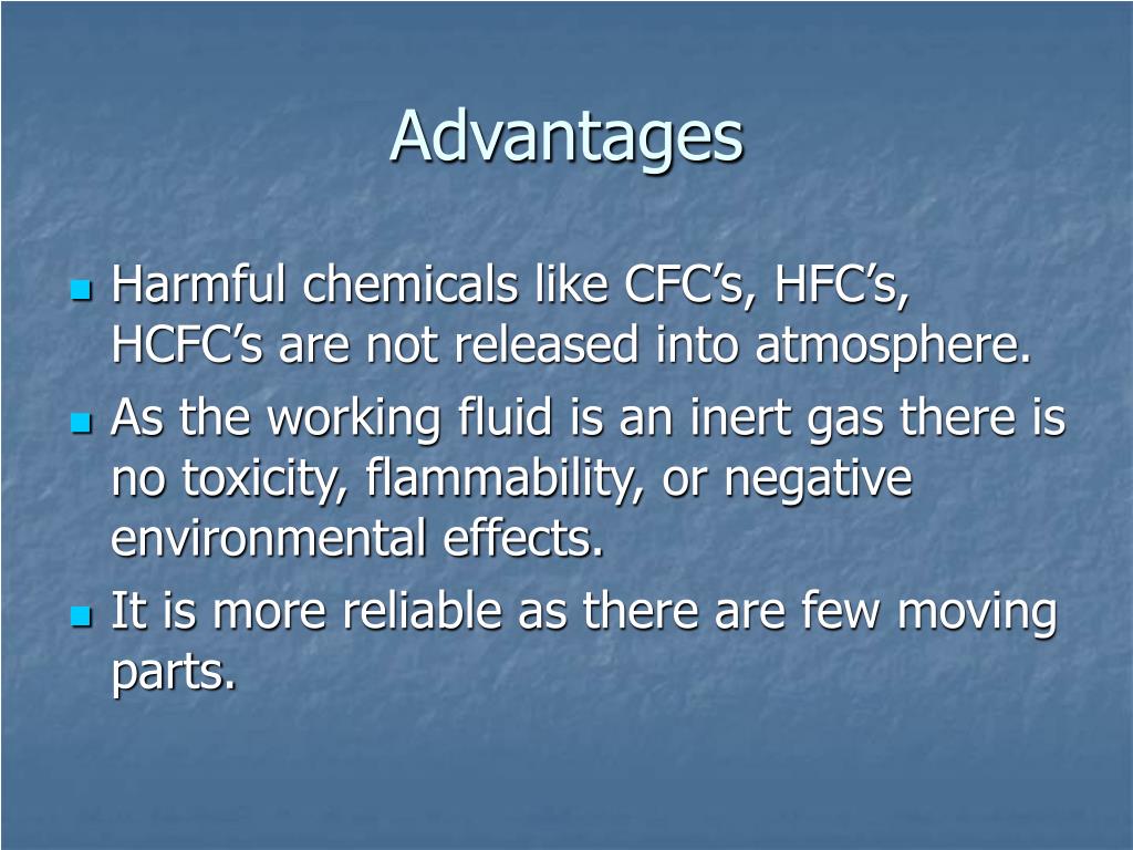 Advantages • Harmful chemicals like CFC’s, HFC’s, HCFC’s are not released into atmosphere. • As the working fluid is an inert gas there is no toxicity, flammability, or negative environmental effects. • It is more reliable as there are few moving parts.