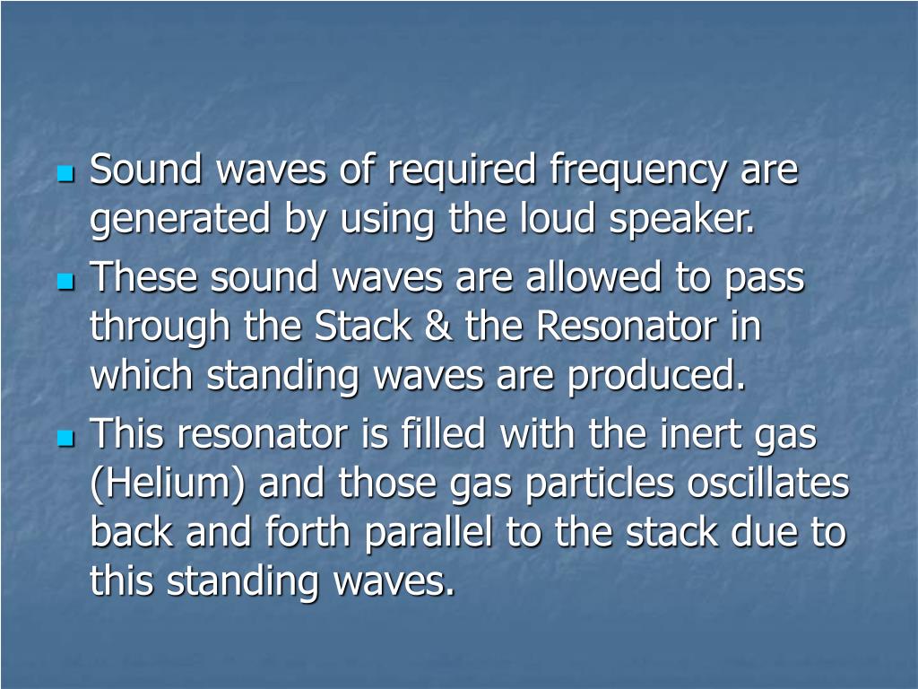 Sound waves of required frequency are generated by using the loud speaker. • These sound waves are allowed to pass through the Stack & the Resonator in which standing waves are produced. • This resonator is filled with the inert gas (Helium) and those gas particles oscillates back and forth parallel to the stack due to this standing waves.