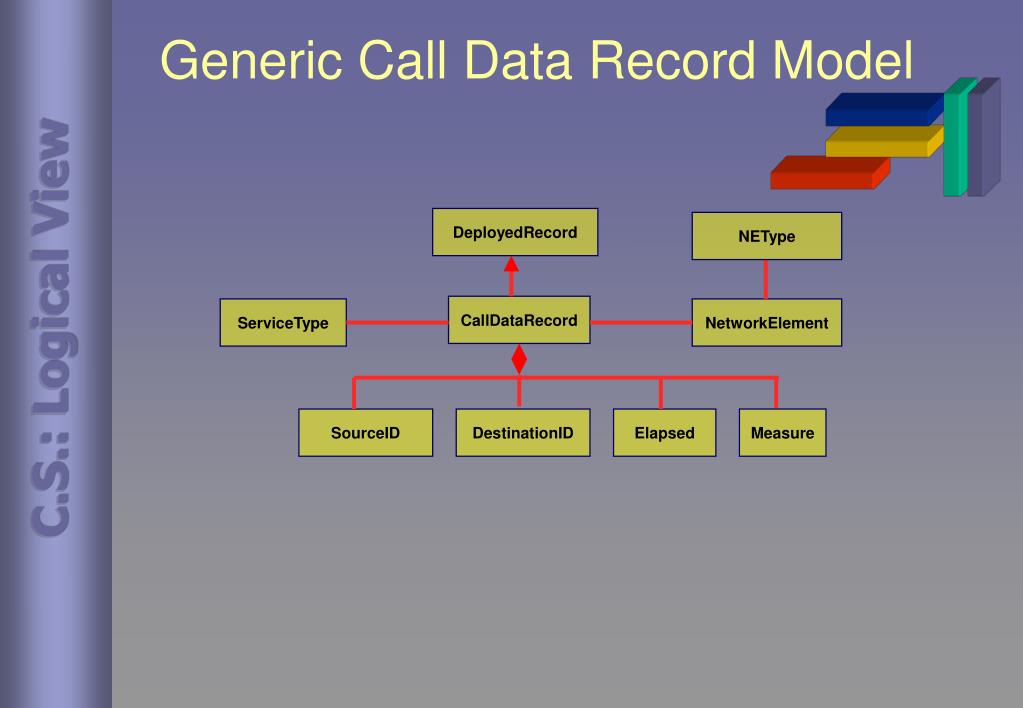 Generic Call Data Record Model DeployedRecord NEType C.S.: Logical View CallDataRecord ServiceType NetworkElement SourceID DestinationID Elapsed Measure